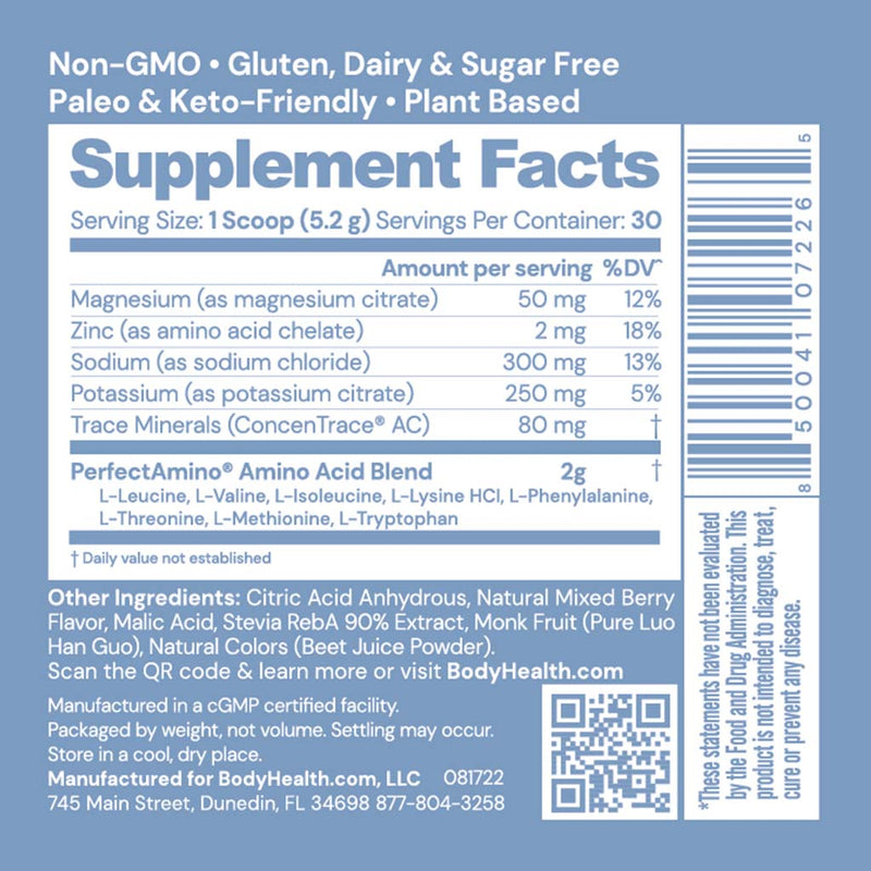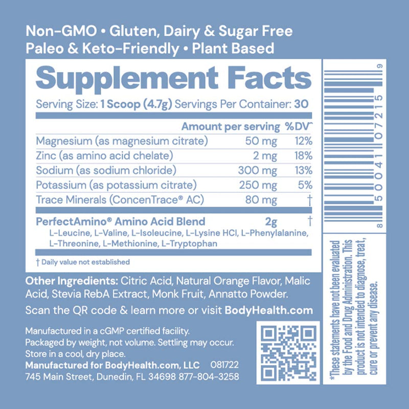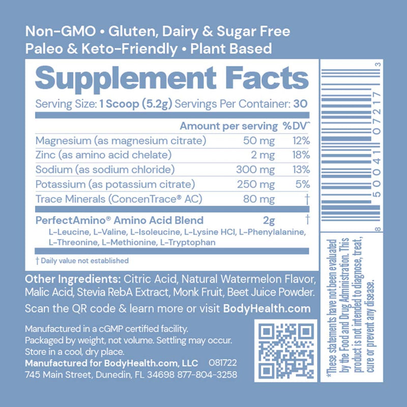 A perfectly balanced, easy to use, and absolutely delicious electrolyte drink formula fortified with PerfectAmino to help rebuild muscle and improve endurance. PerfectAmino Electrolytes are available in Orange, Watermelon, Strawberry, and Mixed Berry flavors.
