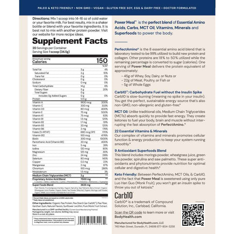 Superfood Blend: 11 different superfoods full of antioxidants and phytonutrients give you the nutrition you need for optimal health and peak performance. PerfectAmino Power Meal includes moringa powder and wheatgrass juice, two of the most nutrient-dense plants in the world, along with cacao, green tea powder, spirulina, and saw palmetto. This blend supports all of your biological processes from energy and mental focus to hormonal balance and stress management.*